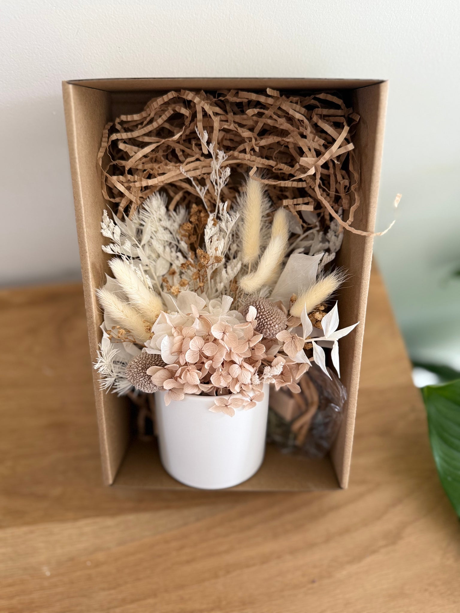 Small gift box includes a small flower arrangement and a car diffuser boxed in a beautiful brown box with a linen ribbon.